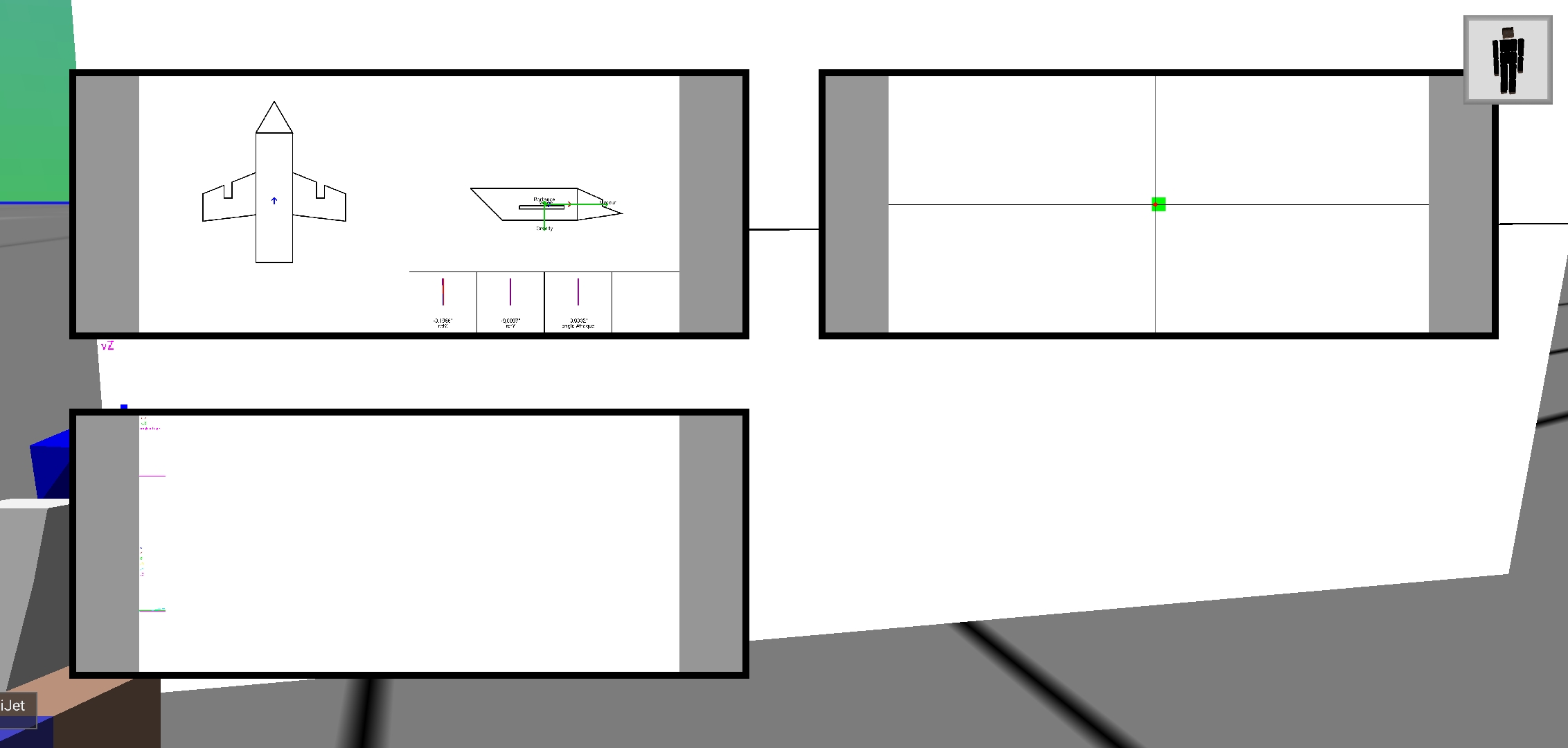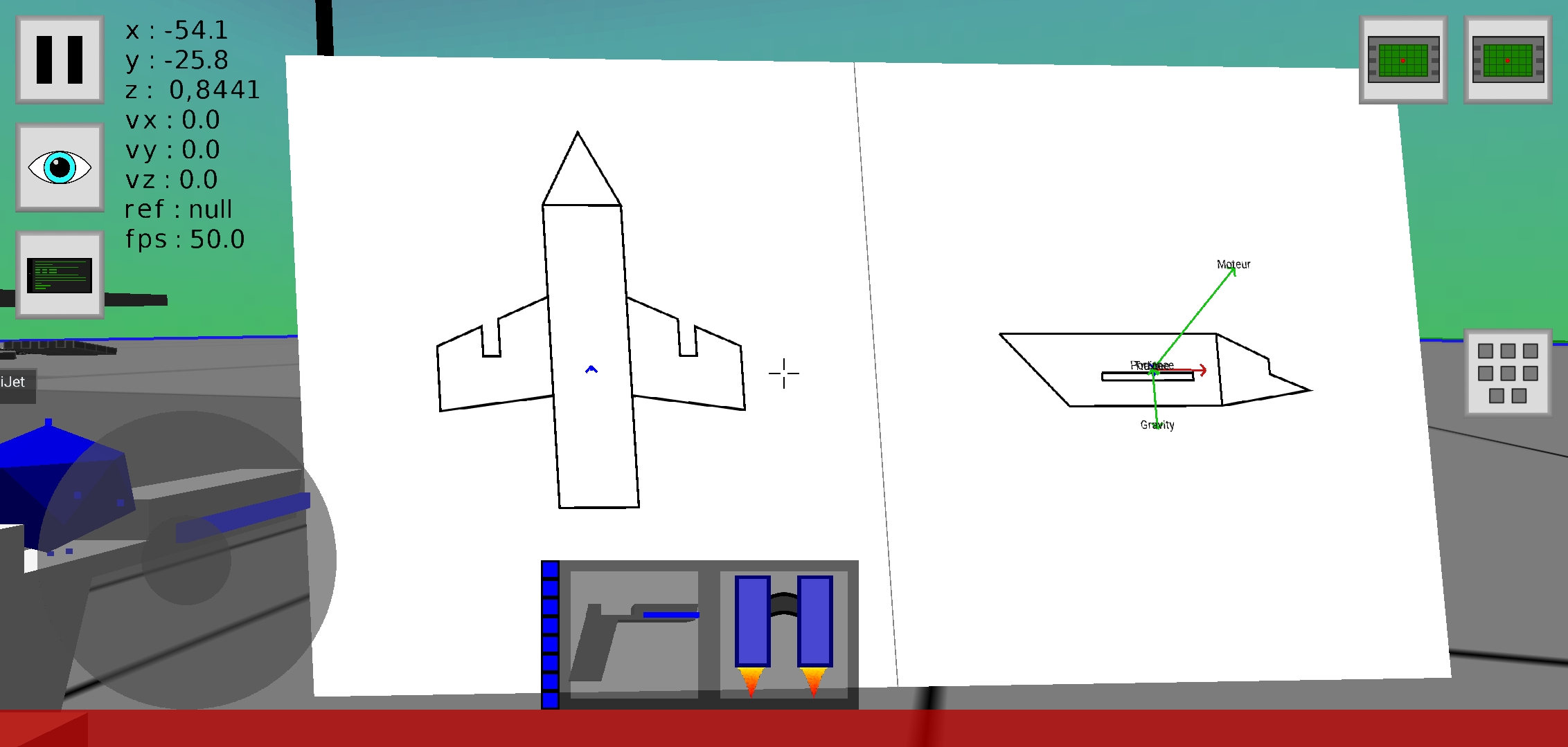 Ici on a trois écrans, un avec les différentes forces s’exercant sur l’avion, celui du millieu avec son historique de positions et le dernier avec des courbes de vitesses.